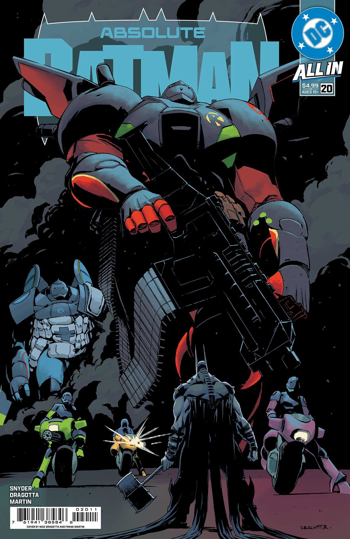 Thanks to the reveal in Absolute Batman #19, DC has dropped Nick Dragotta’s cover for Absolute Batman #20 (May 12), featuring giant mech Robins.